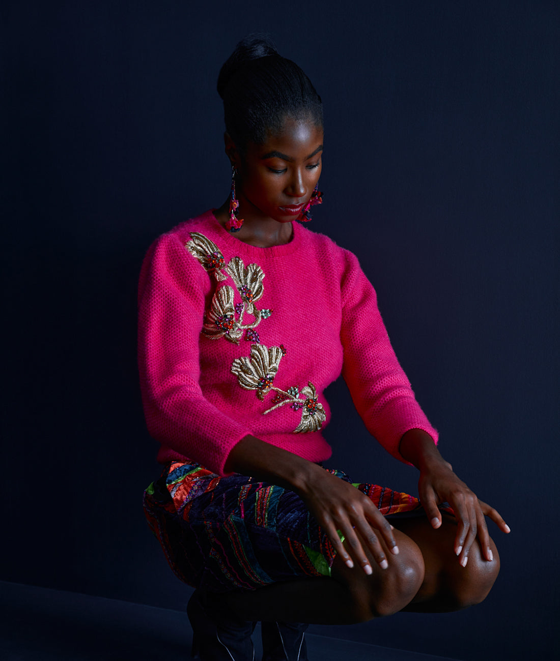 The eye-catching Rowena Silk Velvet Striped Skirt is filled with shimmering hand-embellishments and richly contrasting warm and cool hues. The ethically-crafted midi skirt features a high waisted silhouette, gathered detailing, and a glamorous slit for a flattering fit.