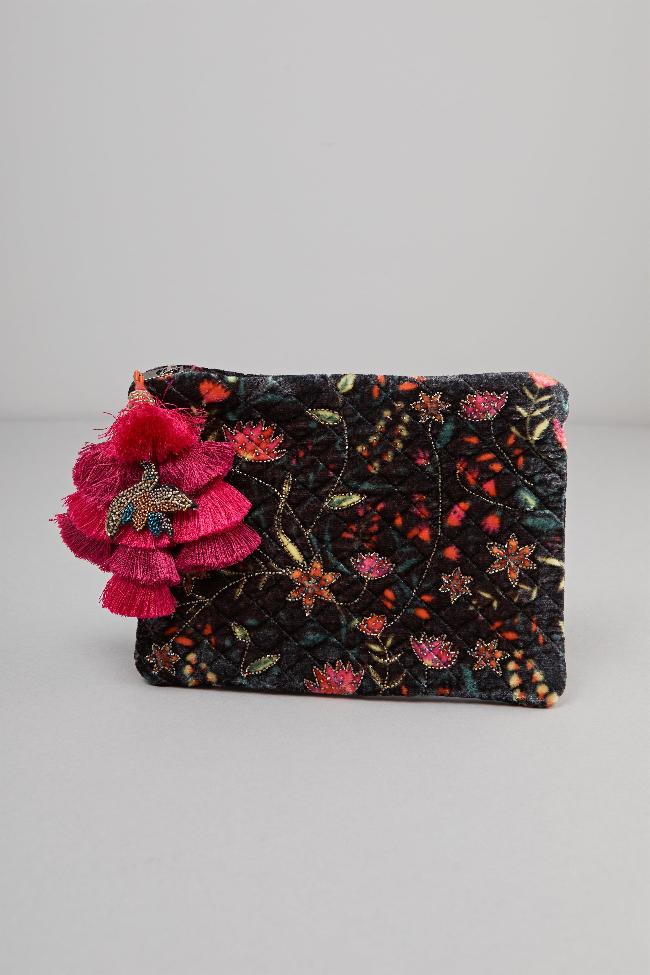 Roopa Pemmaraju’s Embroidered Flower Velvet Pouch is made entirely of silk velvet , focused on the flower and fauna of the garden that blooms in the dark. This pouch features a quilted velvet design with delicate night bloom embroidery detail. The embroidery sits at the front of the pouch and its made with tiny glass beads and metallic thread, showcasing two flowers as an example of the ones that bloom in the dark. This pouch has a zipper closure, with a carefully placed handmade silk tassel, delicate pompoms and a beaded detail showcasing a libelula hanging from the edge.