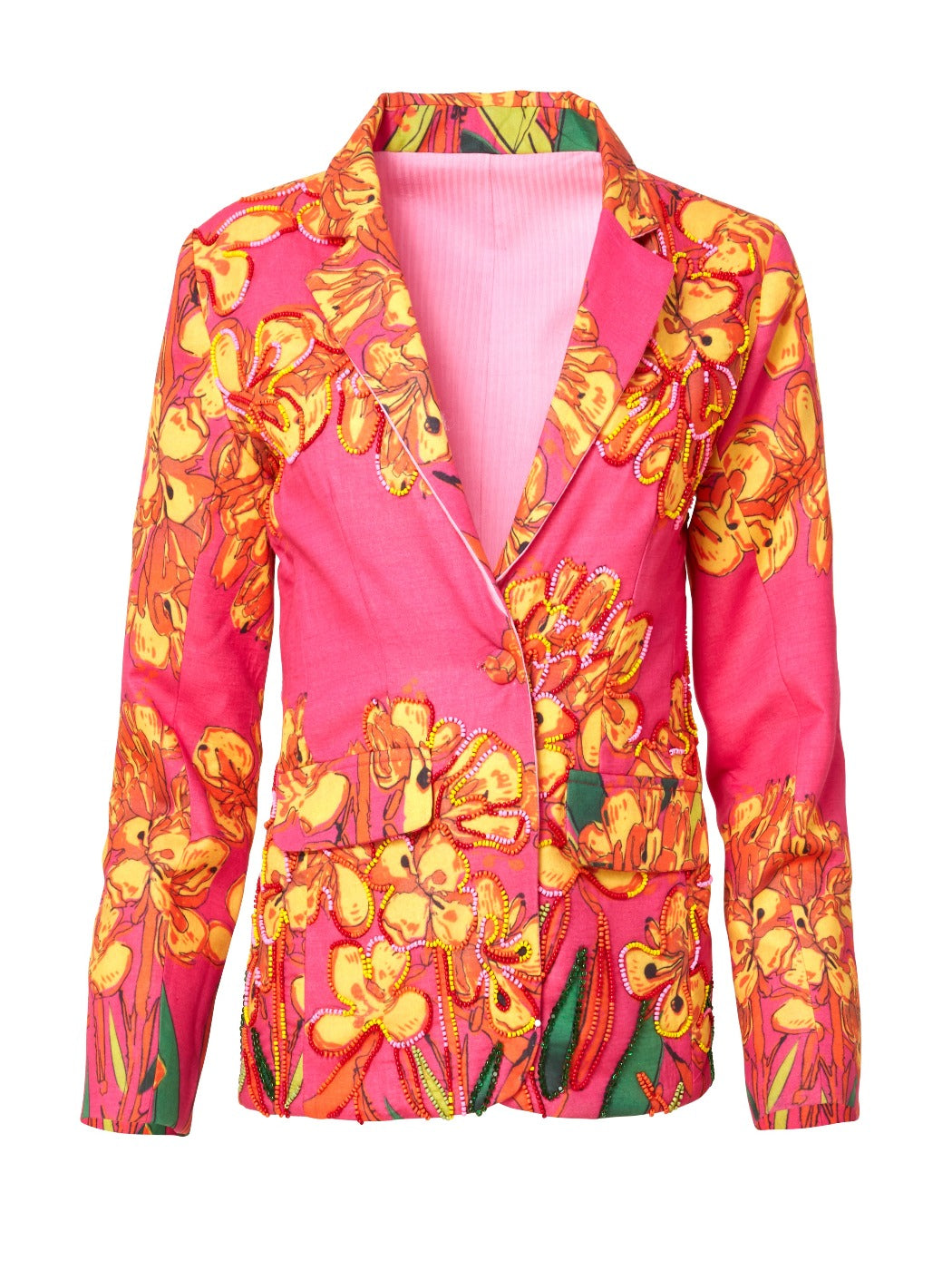 This blazer is a classic silhouette freshly interpreted in a lightweight, ethically made fabrication of corn fiber and recycled cotton. Beaded tropical flowers, side flap pockets, and a notched lapel define the look.