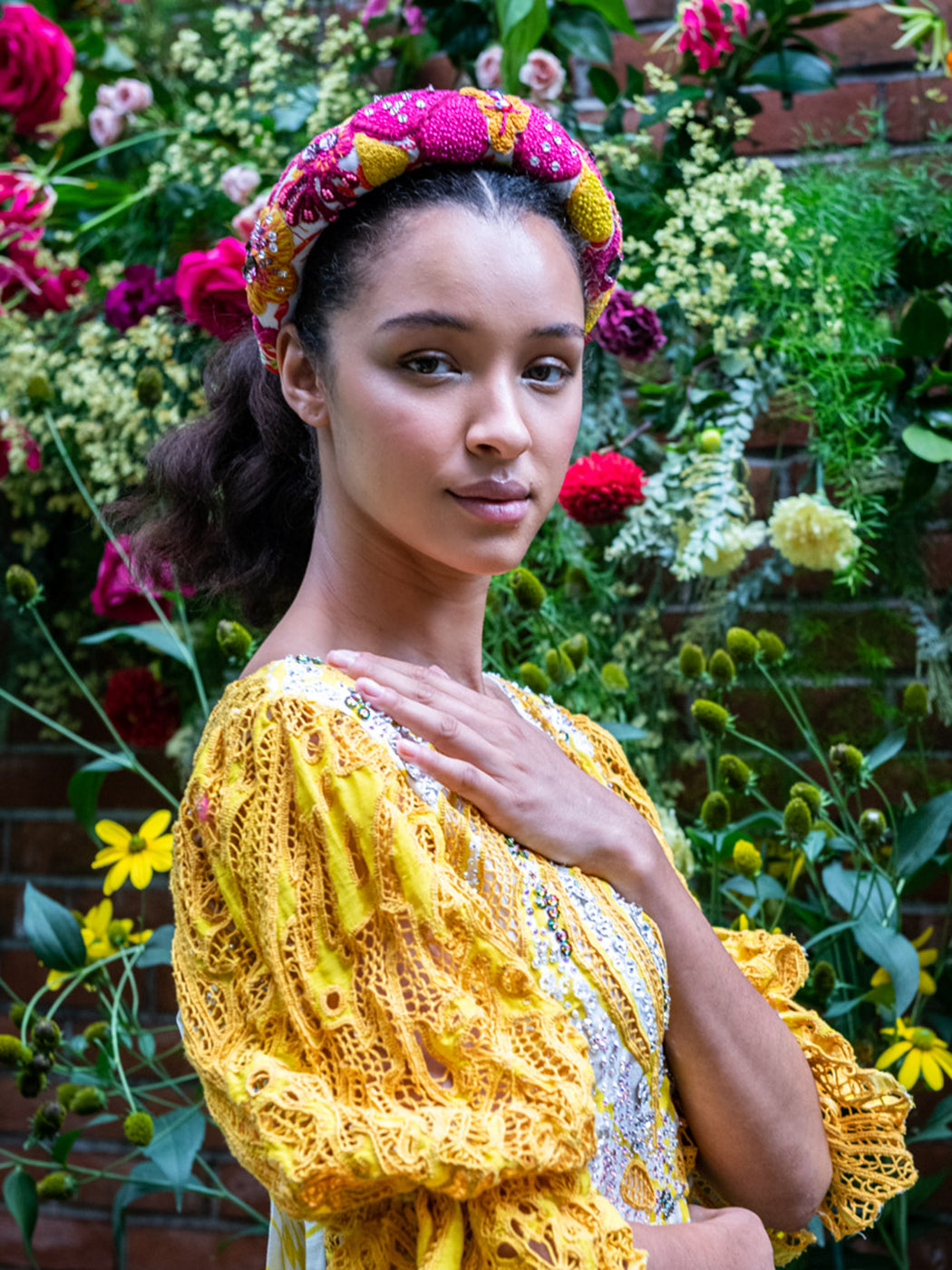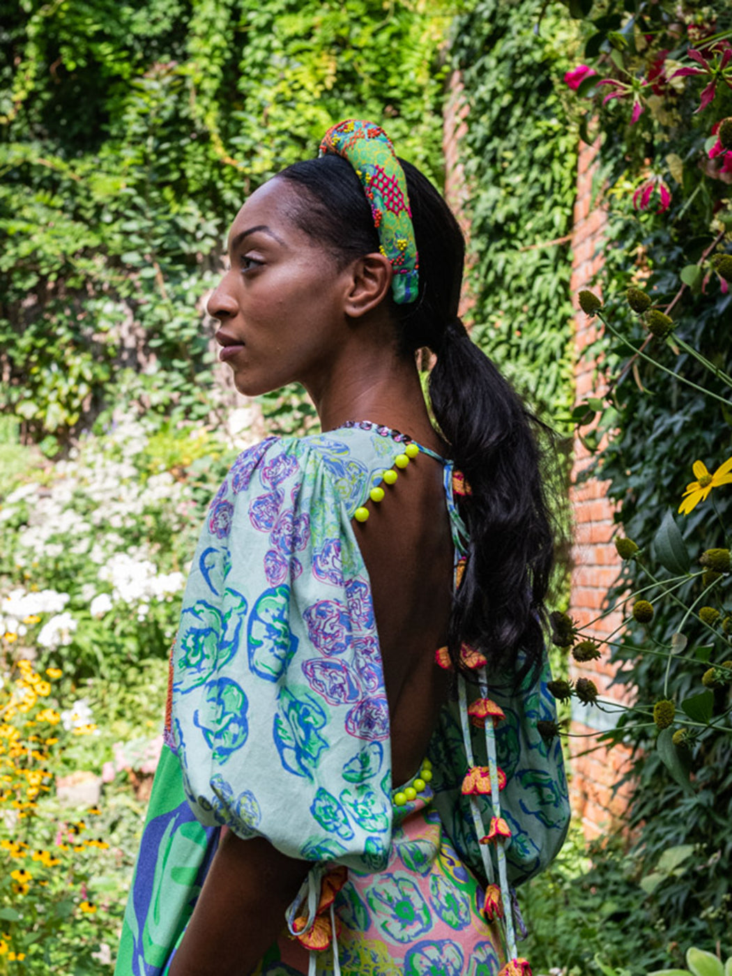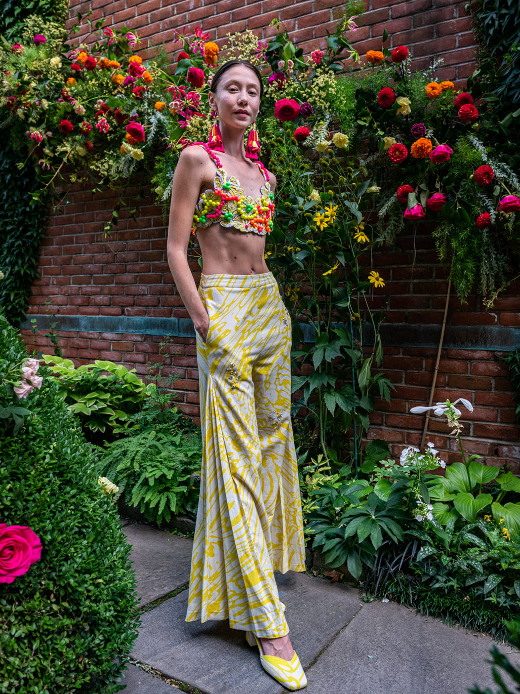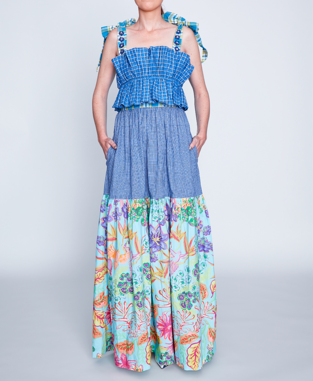 Step into a colorful, enchanting garden with the sustainably crafted Suncatcher Collection. This fully hand-woven collection is a multicultural harmony of exquisite florals, vibrant plaids and magical folk prints inspired by British gardens in India. Explore the garments as they glisten in the light like colorful suncatchers with hand-embellished Swarovski crystals.